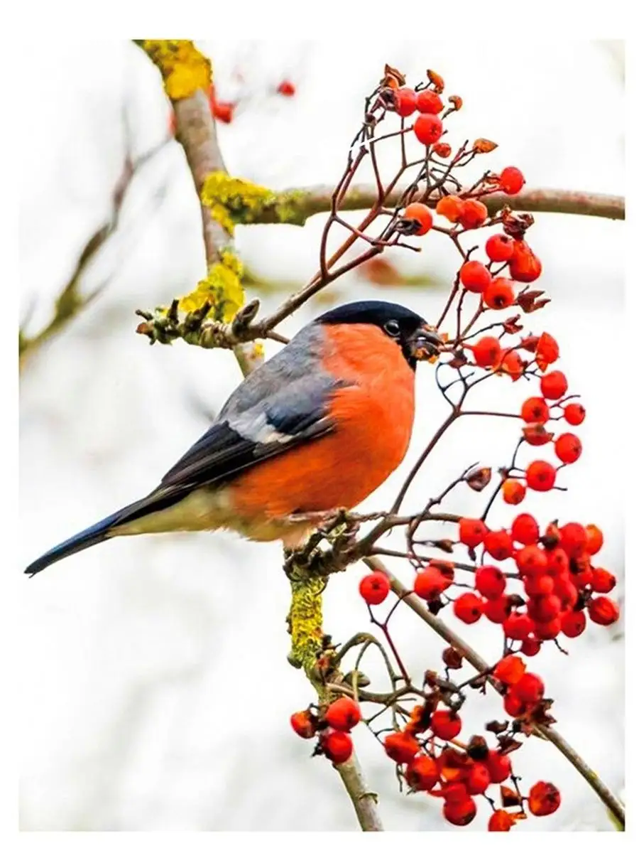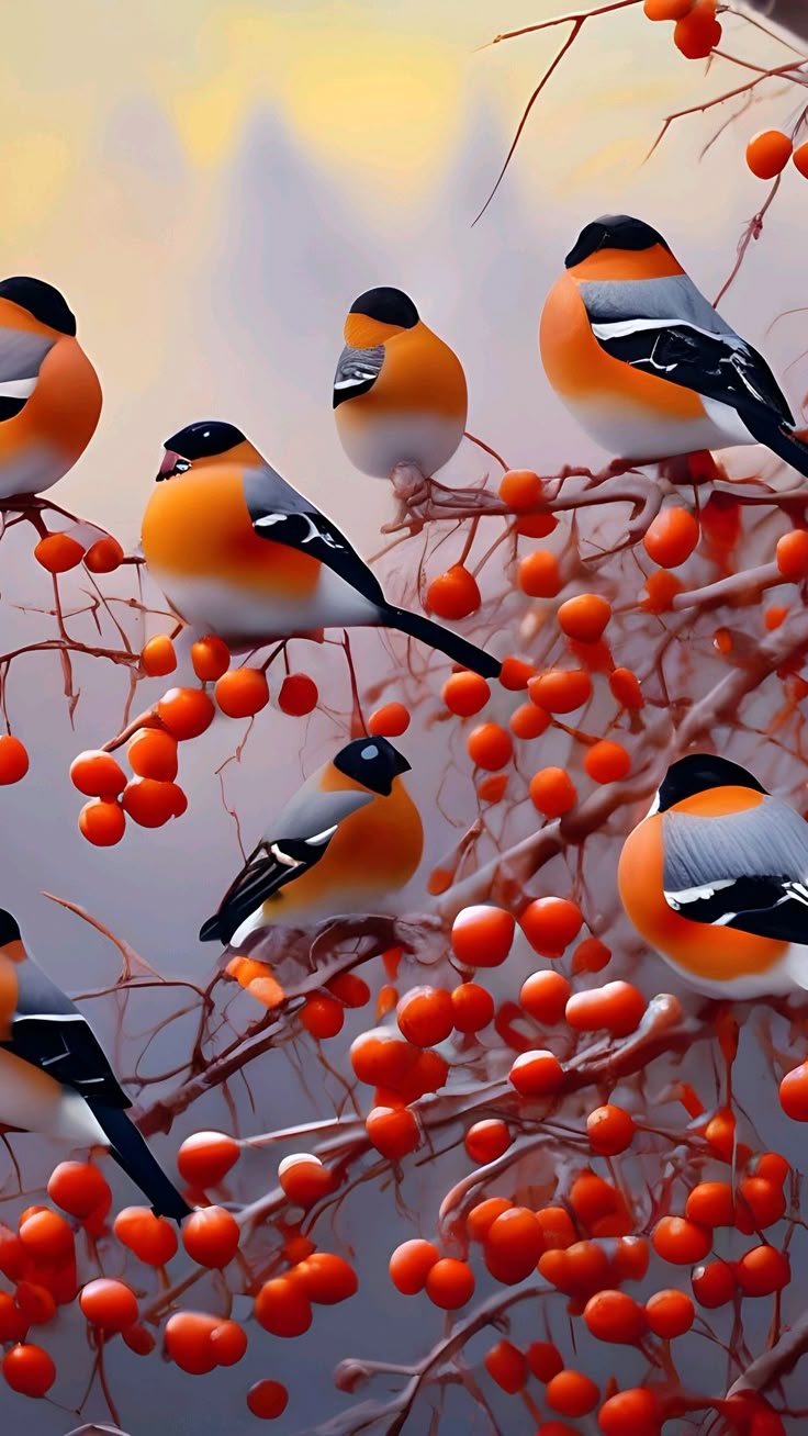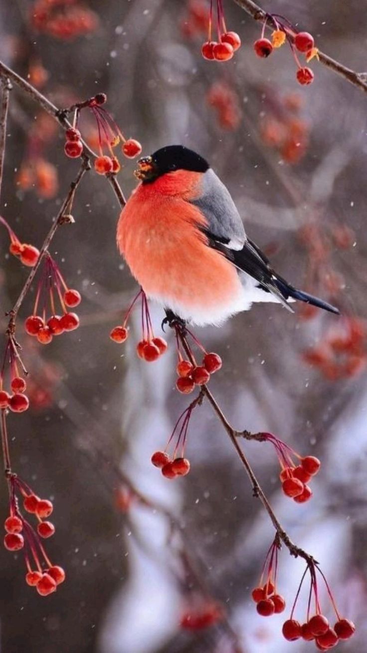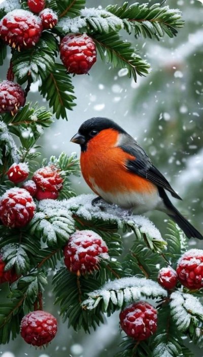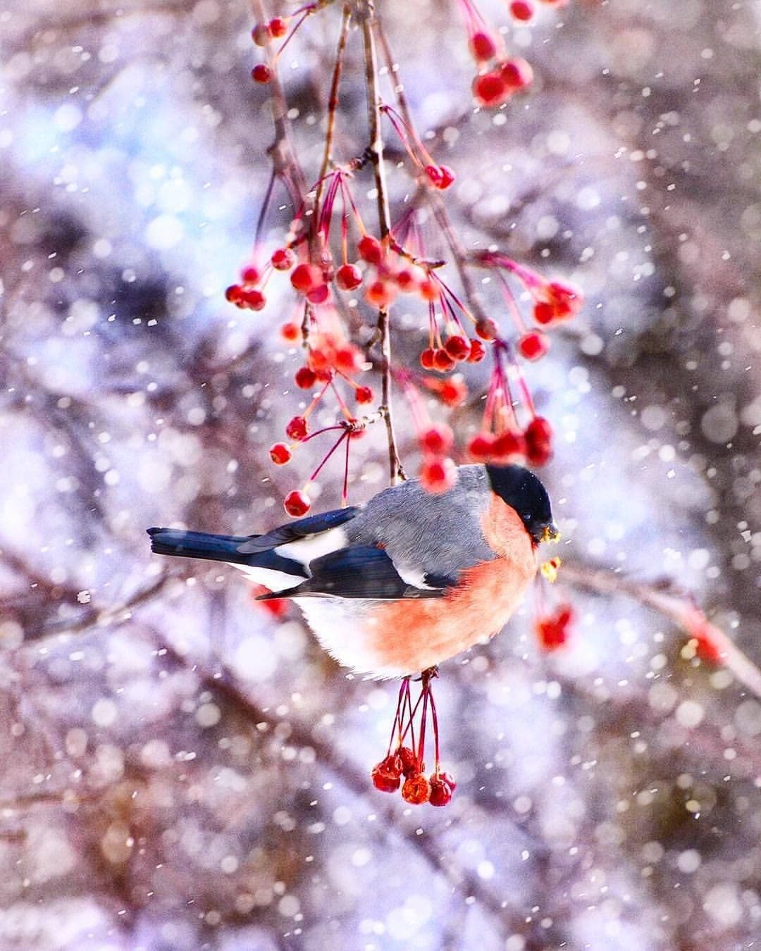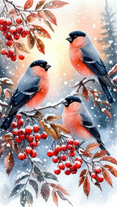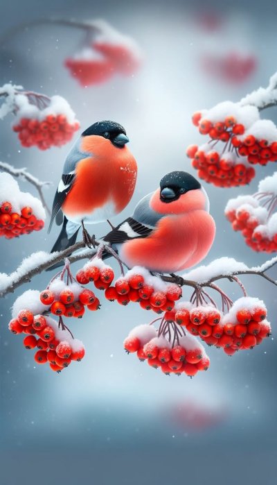 Зимой на заснеженных ветках часто можно увидеть ярких снегирей, которые с удовольствием клюют спелые ягоды рябины. Эти птицы создают неповторимую атмосферу зимнего леса, и вертикальные обои с таким сюжетом идеально подойдут для смартфона. Посмотрите, как красиво сочетаются красные ягоды и пестрое оперение птиц на белом снегу.