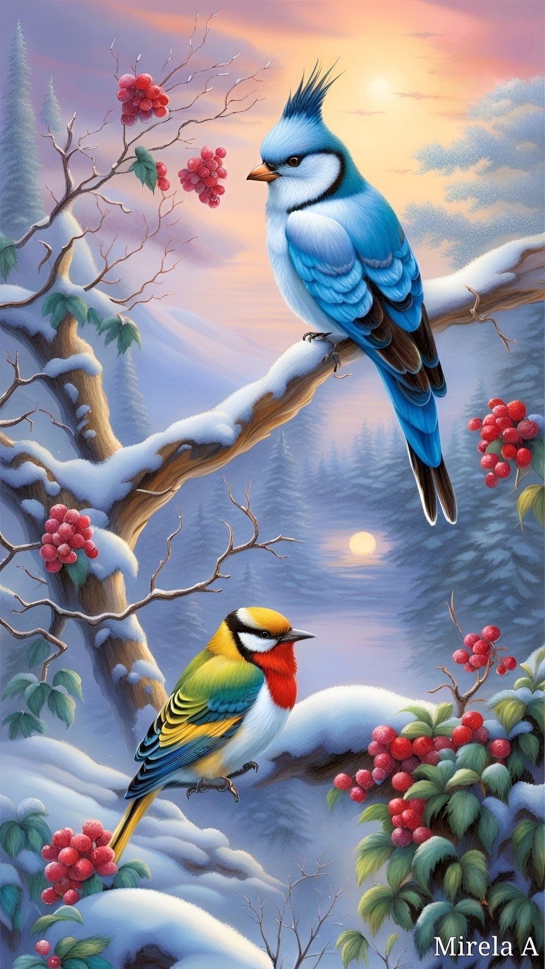 Когда зимой смотришь на морозные узоры на окнах, иногда кажется, что там прячутся маленькие птицы. Эти вертикальные обои перенесут вас в сказочный мир, где пернатые создания парят среди ледяных кристаллов. Каждая деталь проработана так тщательно, что хочется рассматривать их часами.