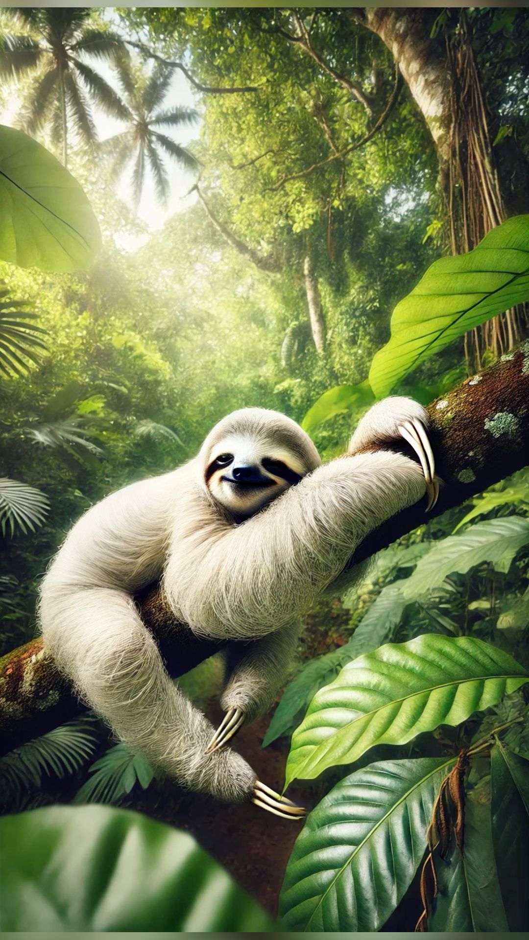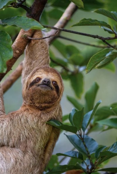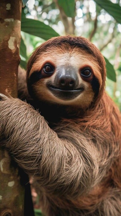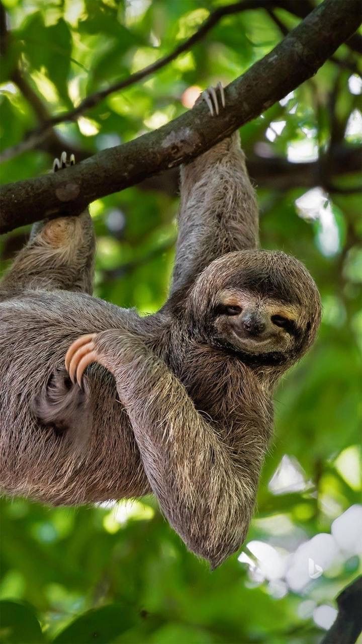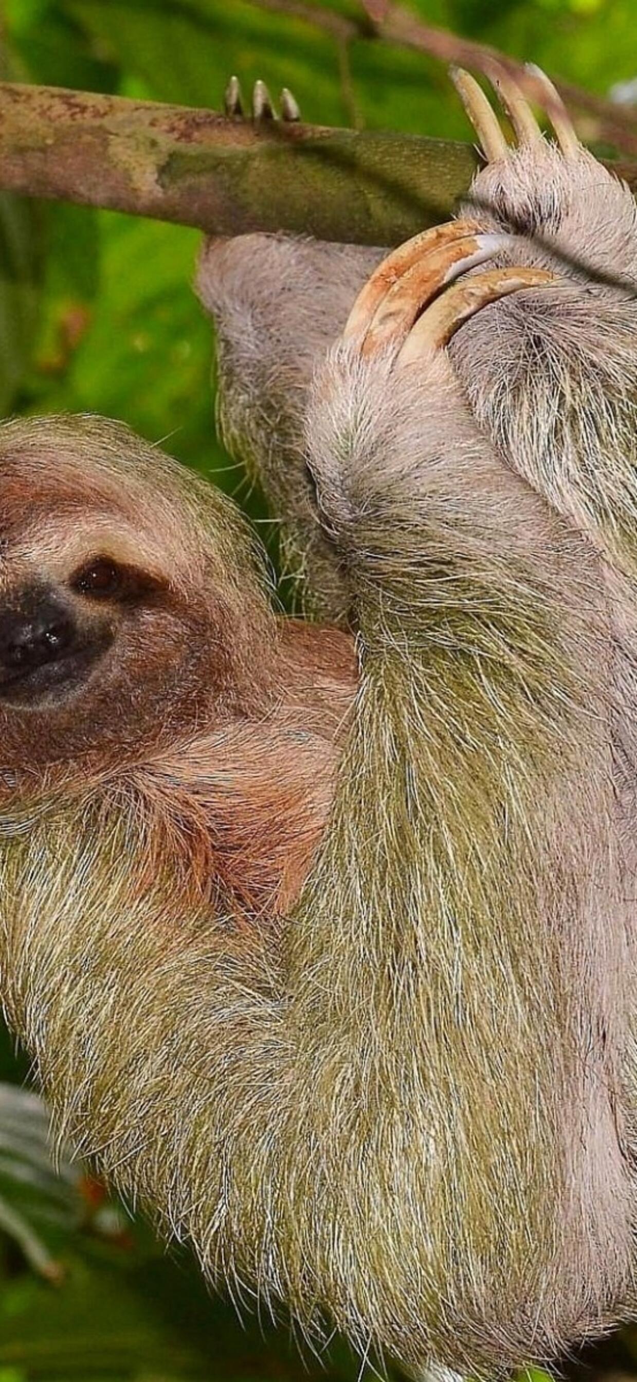 Медлительный ленивец висит вниз головой на ветке тропического дерева, лениво пережевывая листья. Эти вертикальные обои с ленивцем принесут атмосферу тропического леса и спокойствия на экран вашего смартфона. Обратите внимание на длинные когти и задумчивое выражение мордочки этого необычного животного.